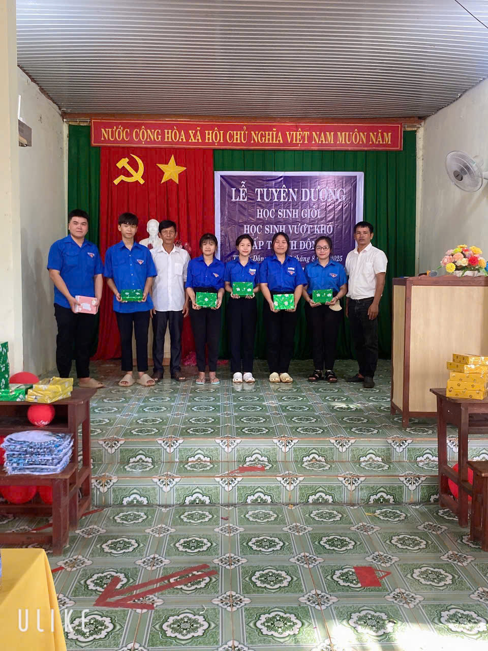 Trong buổi lễ, đồng chí Nguyễn Sĩ Quân - Phó chủ tịch UBND xã cũng đã đại diện trao tặng các phần quà quà động viên cho các em nhỏ lớp Lá chuẩn bị bước vào lớp 1. Đồng thời, ông Lê Viết Hiền cũng trao quà cho các em thanh thiếu niên tích cực tham gia sinh hoạt Đoàn - Hội tại khu dân cư.