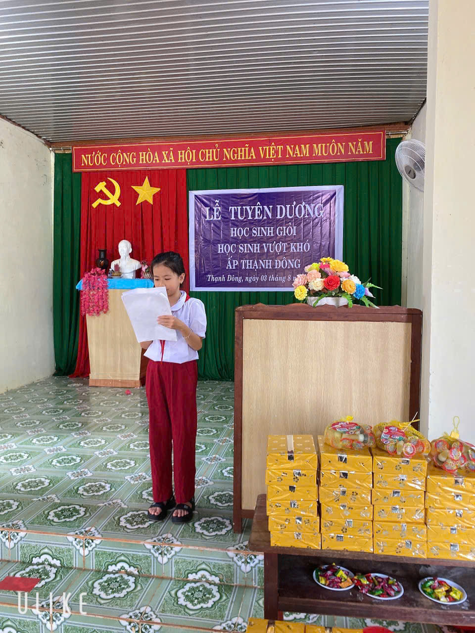 Đồng chí Lê viết hiền Chi hội trưởng Chi hội khuyến học ấp Thạnh Đông tặng quà khích lệ cho các cháu tham gia sinh hoạt đoàn viên, thanh niên tại khu dân cư