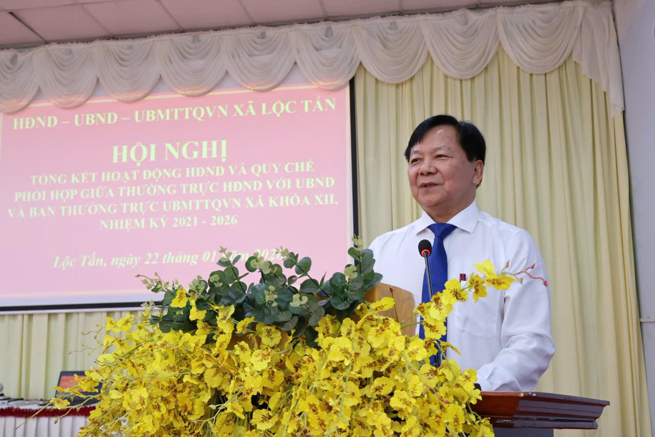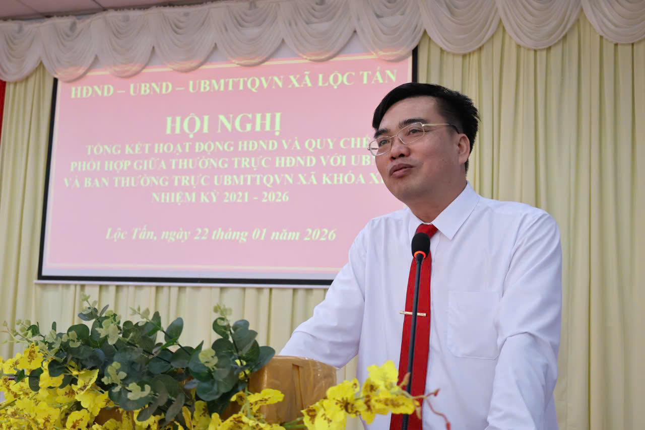 Sáng ngày 22/01/2026, Hội đồng nhân dân xã Lộc Tấn tổ chức Hội nghị tổng kết hoạt động nhiệm kỳ 2021-2026. Đến dự và chỉ đạo Hội nghị có ông Trần Văn Mi - Ủy viên Ban Chấp hành Đảng bộ tỉnh, Phó Chủ tịch Hội đồng nhân dân tỉnh; cùng dự có Thường trực Đảng ủy xã, Thường trực HĐND, lãnh đạo UBND, Ban Thường trực Ủy ban MTTQ Việt Nam xã và các vị đại biểu HĐND xã.