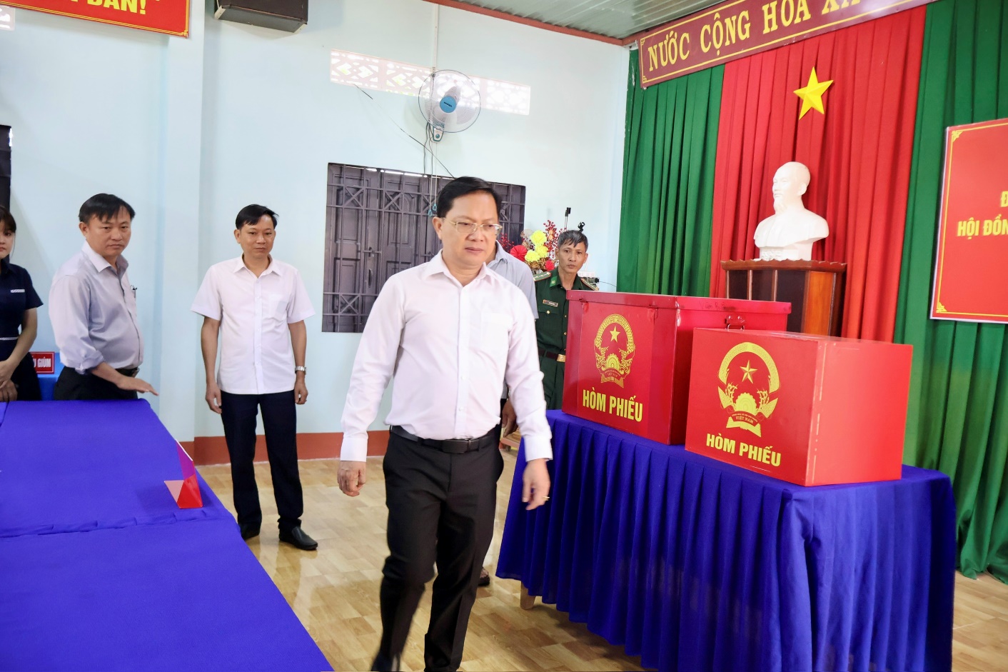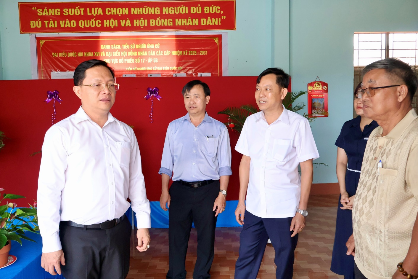 Ông Hà Anh Dũng - Ủy viên Ban Thường vụ Tỉnh ủy, Phó Chủ tịch Thường trực Ủy ban Mặt trận Tổ quốc Việt Nam tỉnh Đồng Nai ( Thứ nhất từ phải qua) tại tổ bầu cử số 9, ấp 1,xã Lộc Tấn. Ảnh: Thúy Anh