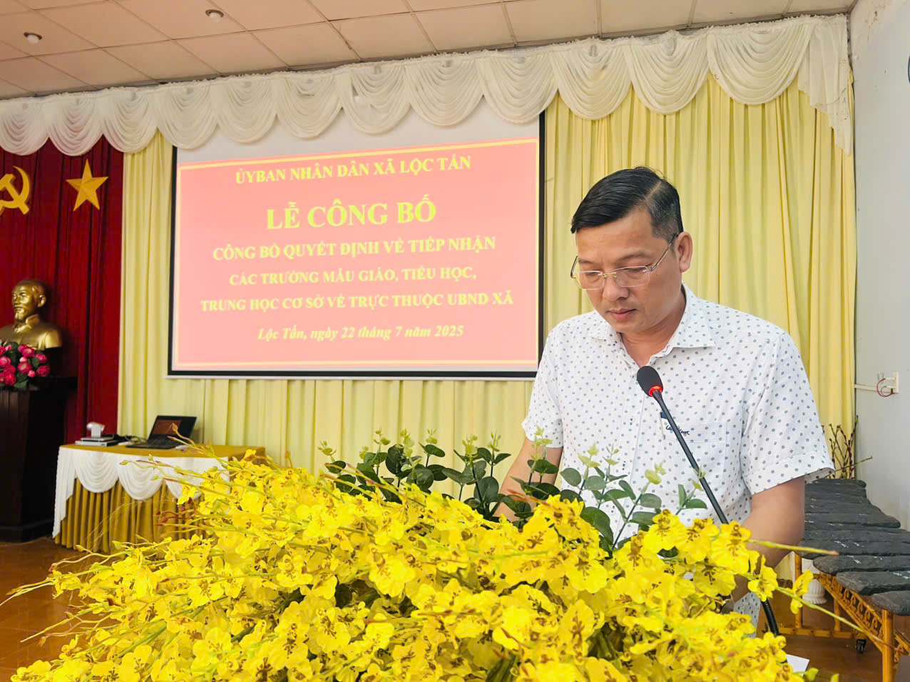 Ngày 22/7/2025 – Trong không khí phấn khởi của toàn xã đang bước vào giai đoạn kiện toàn bộ máy sau sắp xếp đơn vị hành chính, UBND xã Lộc Tấn long trọng tổ chức Lễ công bố các Quyết định tiếp nhận các trường Mẫu giáo, Tiểu học và Trung học cơ sở về trực thuộc UBND xã quản lý. Đây là sự kiện có ý nghĩa đặc biệt, đánh dấu bước chuyển mình quan trọng trong công tác phân cấp quản lý giáo dục trên địa bàn xã.