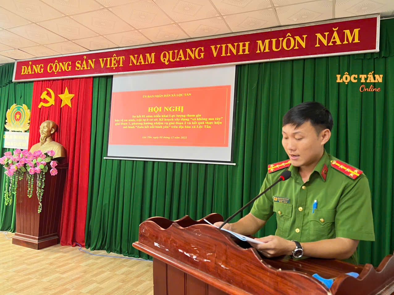 1. Hội nghị sơ kết 01 năm triển khai Lực lượng tham gia bảo vệ an ninh, trật tự ở cơ sở; Kế hoạch xây dựng "xã không ma túy" giai đoạn 1, phương hướng nhiệm vụ giai đoạn 2 và kết quả thực hiện mô hình "Zalo kết nối bình yên" trên địa bàn xã Lộc Tấn