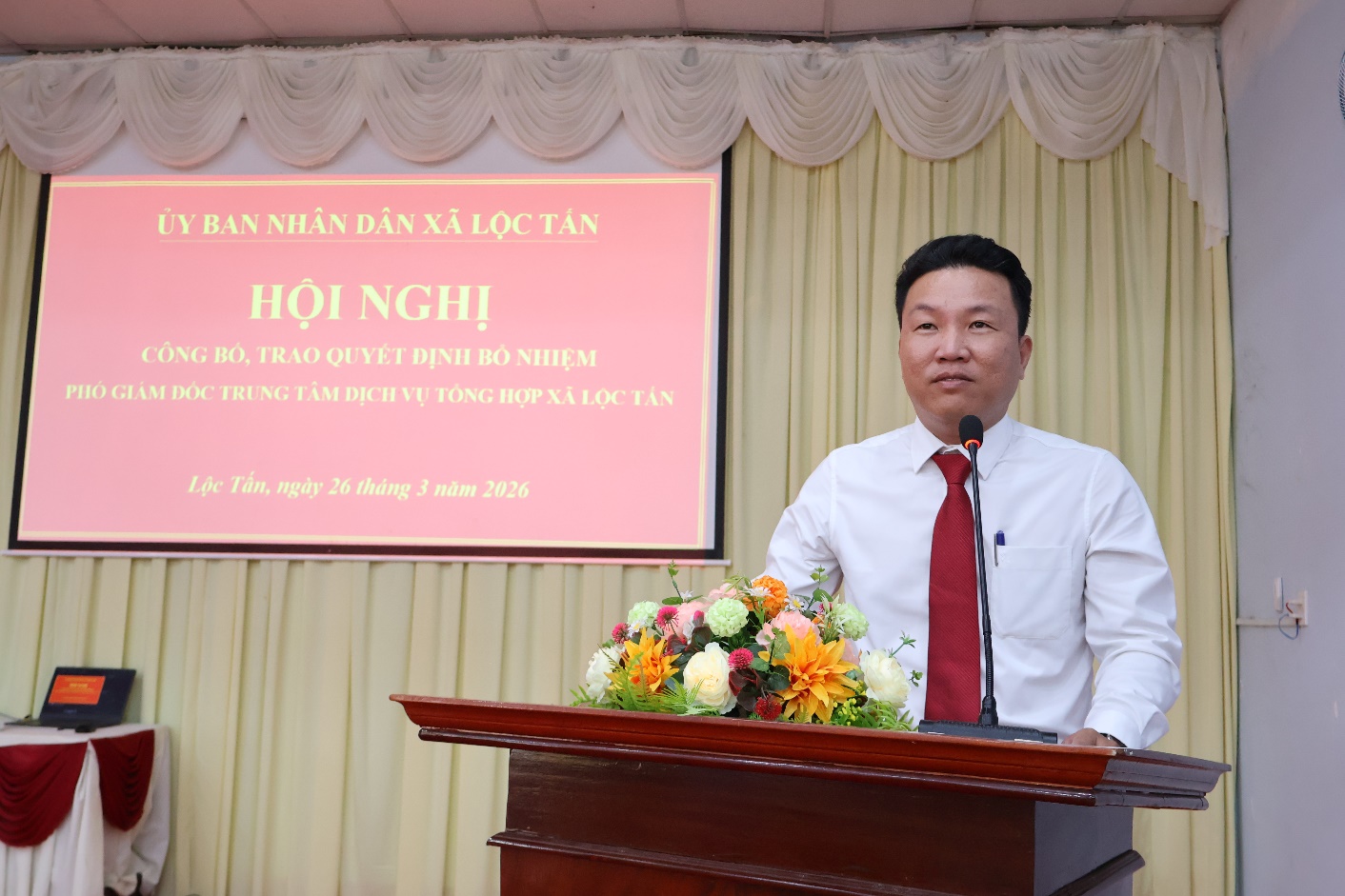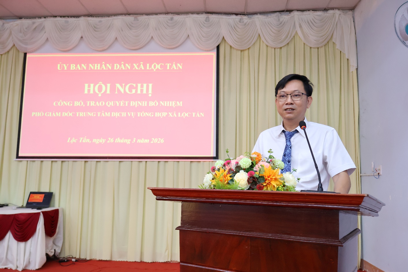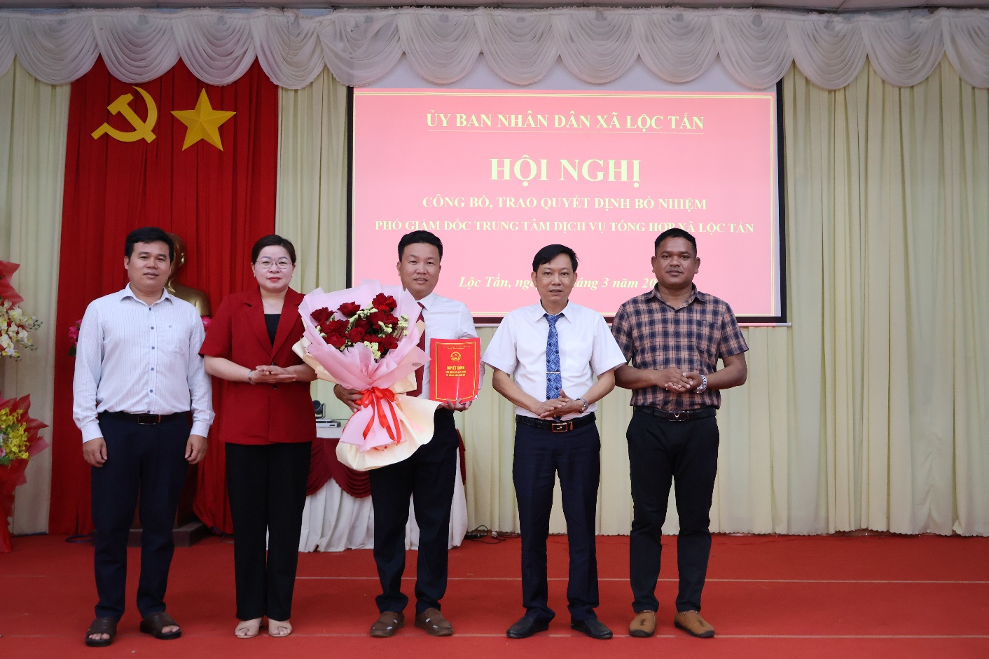Tại Hội nghị, ông Nguyễn Trung Thông - Phó Trưởng phòng Văn hóa - Xã hội xã công bố Quyết định bổ nhiệm ông Hoàng Xuân Hiếu, sinh năm 1985, đang giữ chức vụ Phó Trưởng Ban Văn hóa - Xã hội HĐND xã, sang giữ chức vụ Phó Giám đốc Trung tâm Dịch vụ tổng hợp xã Lộc Tấn. Thời hạn bổ nhiệm là 05 năm kể từ ngày ký quyết định.