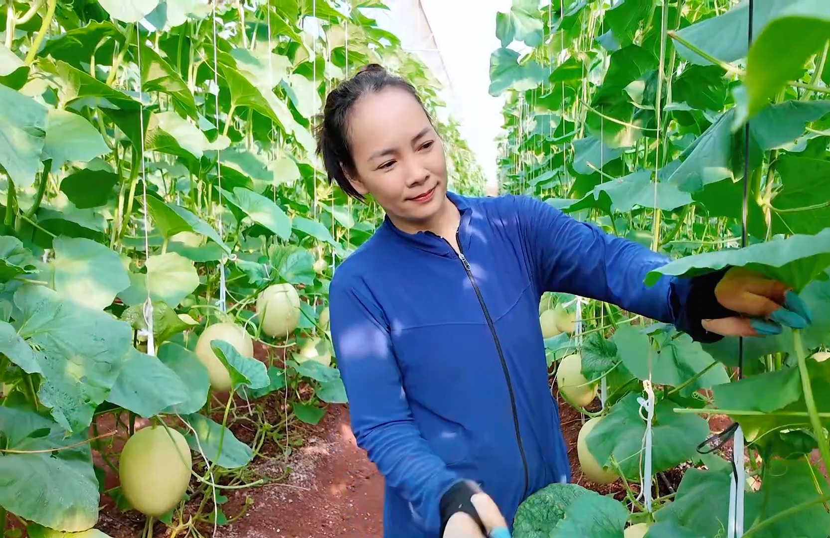 Chị Bùi Thị Hường - Ấp Thạnh Đông, xã Lộc Tấn với vườn dưa lưới rộng 2.000m2 mang lại thu nhập cao cho gia đình đang được chính quyền địa phương hỗ trợ tham gia mô hình Ocop. Ảnh: Thúy Anh