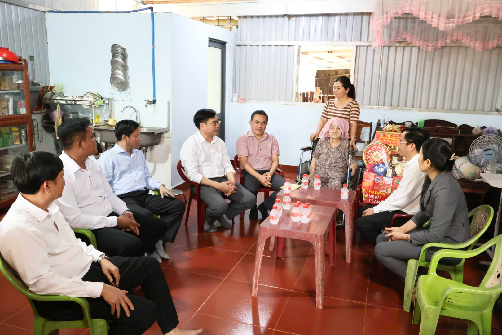 Ông Lê Trường Sơn - Ủy viên Ban Thường vụ Tỉnh ủy - Phó Chủ tịch UBND tỉnh ( thứ 2 từ trái qua) hỏi thăm tình hình sức khỏe, đời sống của Mẹ Việt Nam Anh hùng Bùi Thị Năm. Ảnh: Thúy Anh