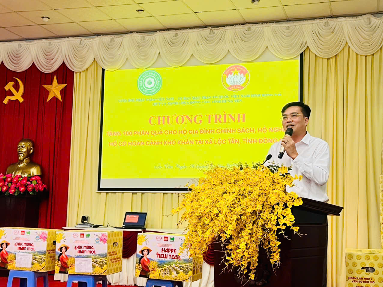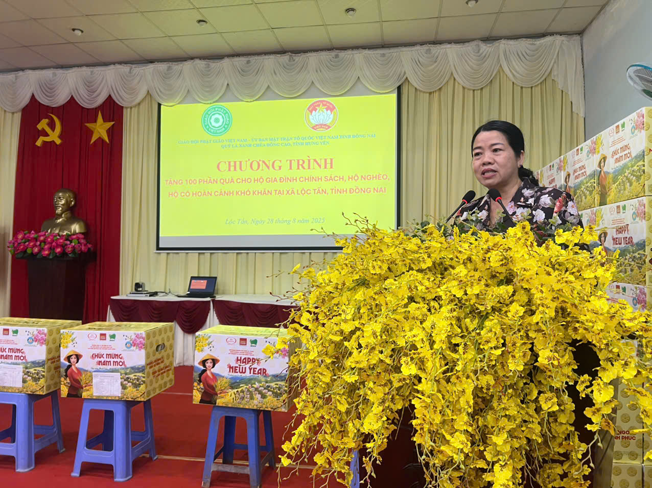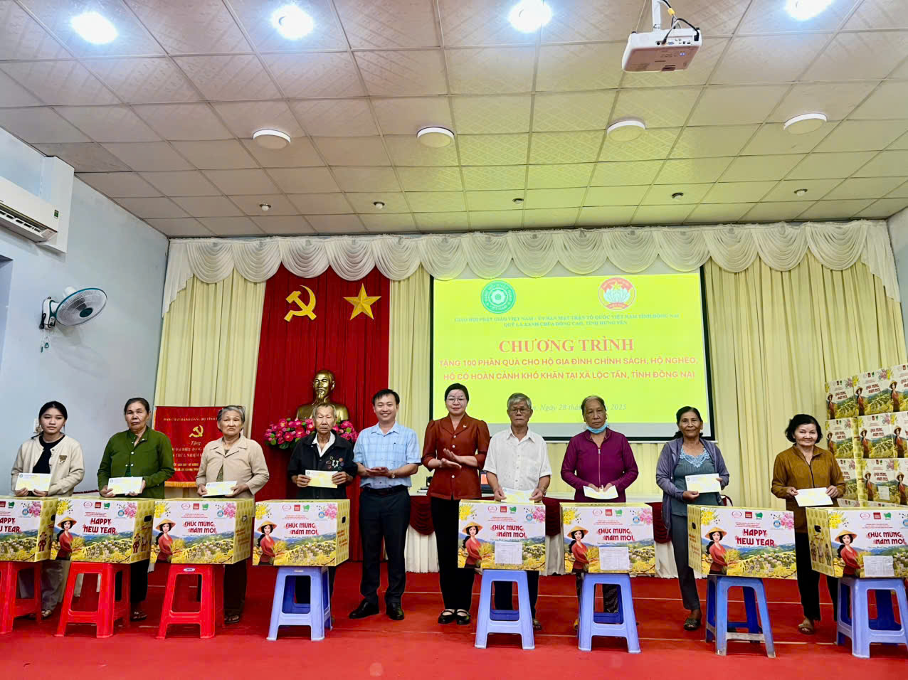 Tại buổi lễ, Ủy ban MTTQ Việt Nam tỉnh Đồng Nai phối hợp cùng Ban Thường trực UBMTTQ xã Lộc Tấn và Giáo hội Phật giáo Việt Nam tỉnh đã trao tặng 100 phần quà cho các hộ gia đình chính sách, hộ có hoàn cảnh khó khăn trên địa bàn.