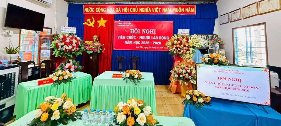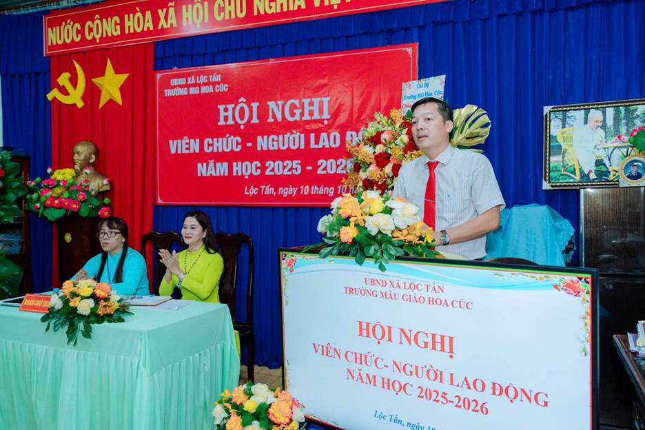 Thực hiện Hướng dẫn của Sở Giáo dục và Đào tạo cùng Kế hoạch của Ủy ban nhân dân xã Lộc Tấn về việc tổ chức Hội nghị viên chức - người lao động năm học 2025 - 2026, chiều ngày 10 tháng 10 năm 2025, Trường Mẫu giáo Hoa Cúc đã long trọng tổ chức Hội nghị viên chức - người lao động năm học 2025 - 2026.