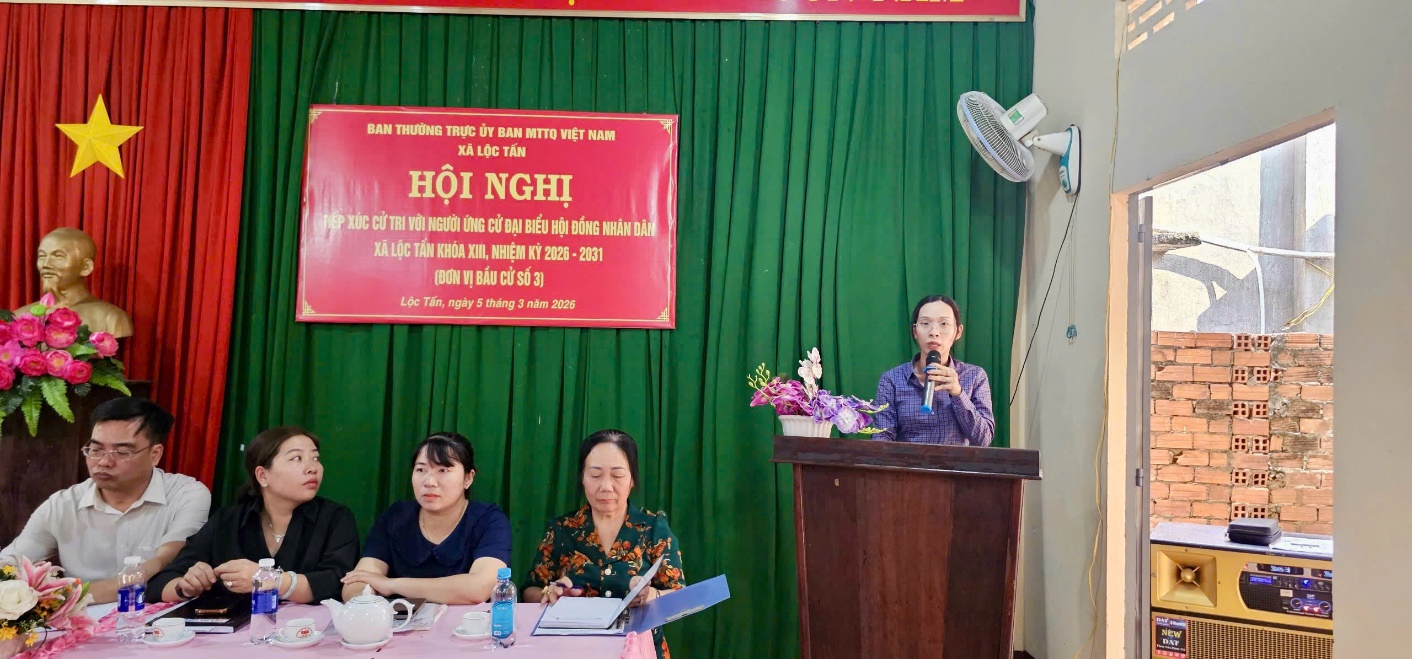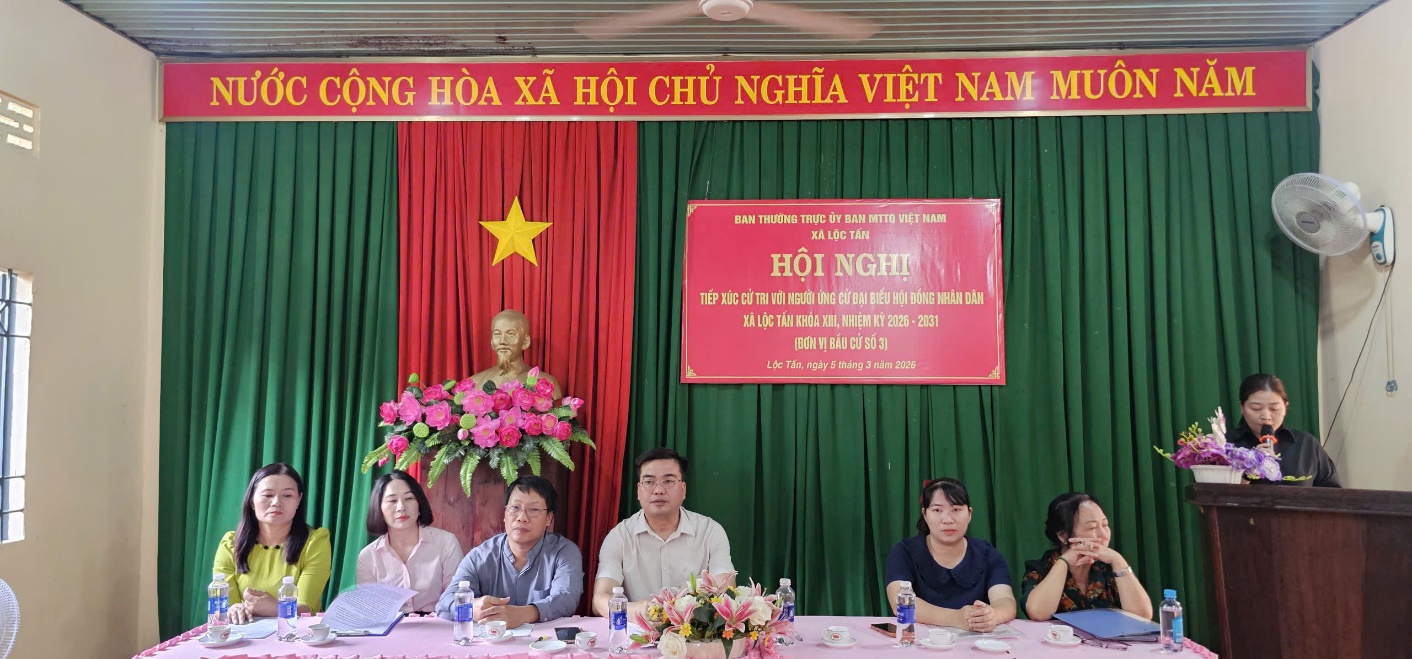 Chiều 5-3, Ban Thường trực Ủy ban MTTQ Việt Nam xã Lộc Tấn tổ chức các hội nghị tiếp xúc cử tri với những người ứng cử đại biểu HĐND xã nhiệm kỳ 2026-2031 theo Kế hoạch số 18/KH-MTTQ-BTT ngày 25-2-2026.