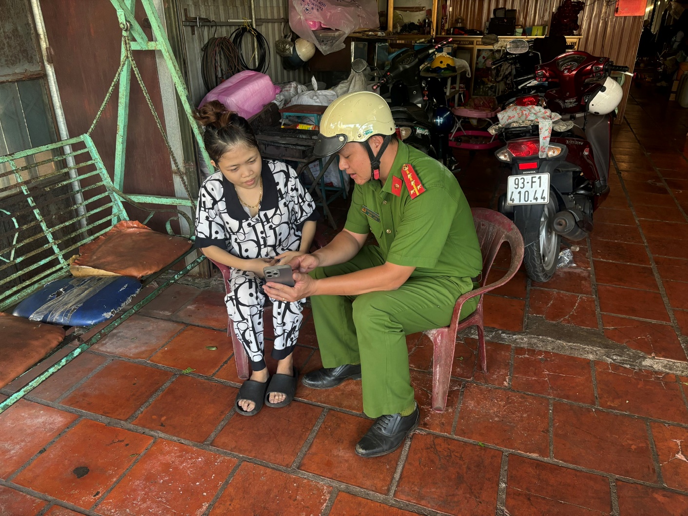 Công an xã Lộc Tấn đang hướng dẫn người dân thủ tục cài đặt, kích hoạt tài khoản trên ứng dụng VneID