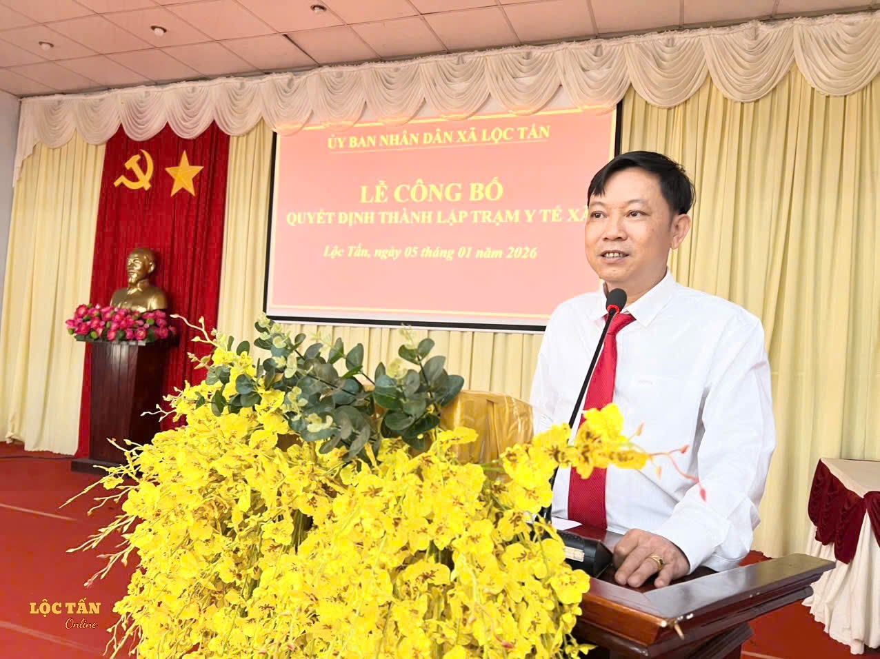 Sáng nay, ngày 05/01/2026, Ủy ban nhân dân xã Lộc Tấn đã tổ chức lễ công bố các Quyết định của UBND xã liên quan đến việc thành lập, kiện toàn tổ chức và phân công phụ trách Trạm Y tế xã Lộc Tấn. Tham dự buổi lễ có ông Hoàng Mạnh Thường - bí thư Đảng ủy, chủ tịch HĐND xã; ông Nguyễn Mạnh Dũng - Phó bí thư, chủ tịch UBND xã; bà Đinh Thị Mỹ Hạnh - Phó Chủ tịch HĐND xã; ông Nguyễn Sĩ Quân - Phó chủ tịch UBND xã; ông Đặng Thành Chung - Trưởng phòng Văn hóa - Xã hội; đại diện các phòng, ban, ngành và cán bộ, công chức, viên chức có liên quan.
