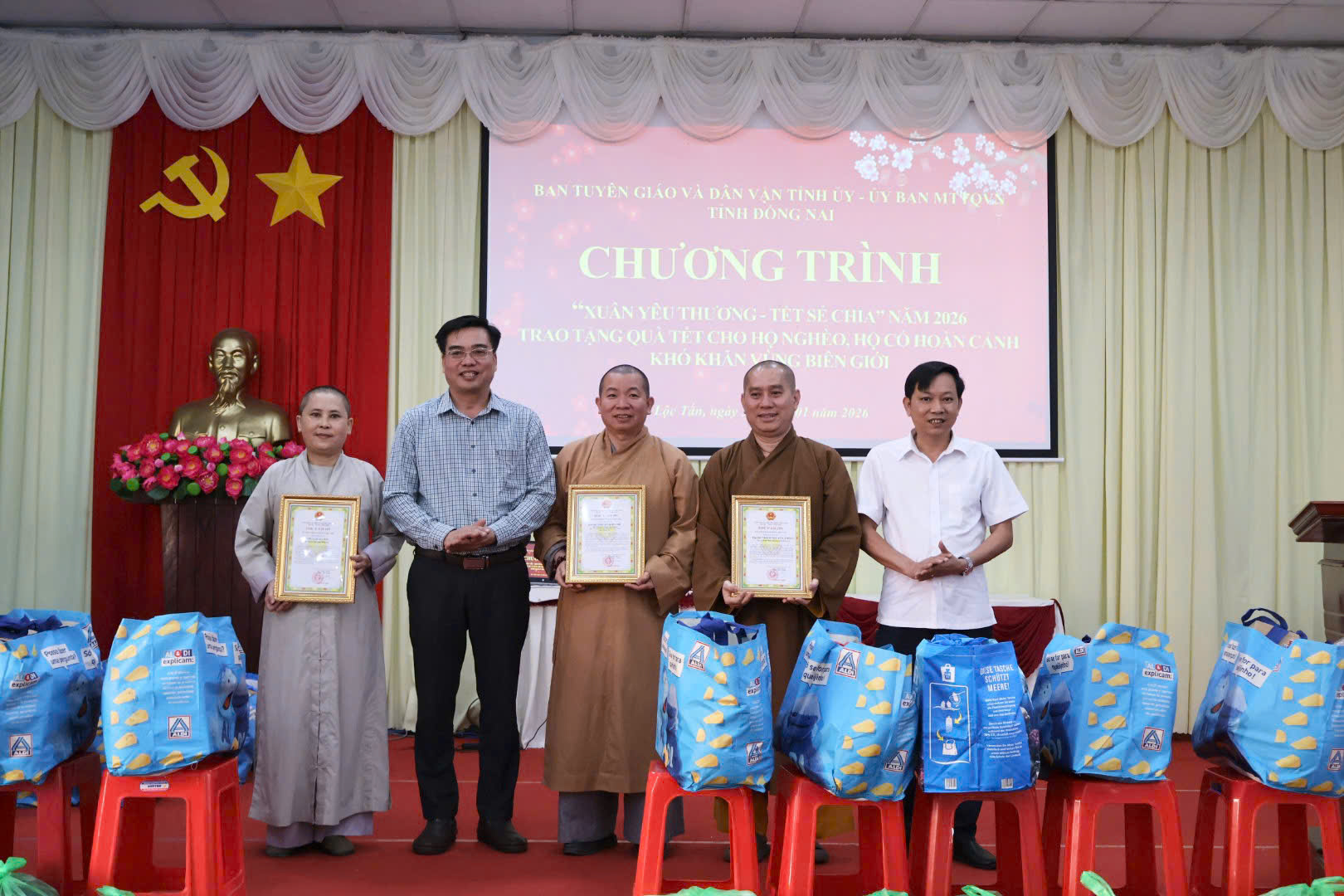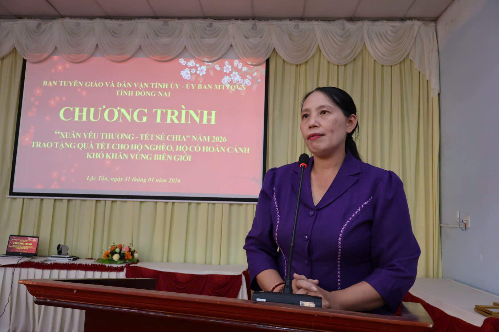 Trong không khí phấn khởi của những ngày giáp Tết Nguyên đán Bính Ngọ năm 2026, ngày 31/01/2026 Ban Tuyên giáo và Dân vận Tỉnh ủy Đồng Nai phối hợp với Ủy ban Mặt trận Tổ quốc Việt Nam tỉnh và Đảng ủy - UBND - Ủy ban MTTQ Việt Nam xã Lộc Tấn tổ chức Chương trình trao tặng quà Tết “Xuân Yêu Thương - Tết Chia Sẻ” cho các hộ nghèo, hộ có hoàn cảnh khó khăn vùng biên giới.