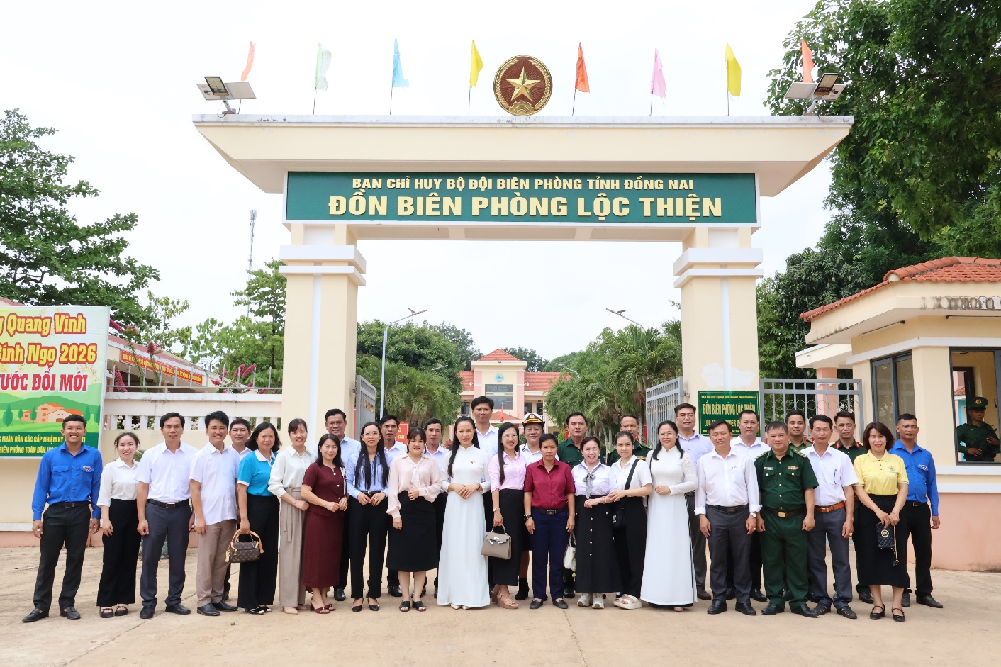 Các đại biểu chụp hình lưu niệm tại Đồn Biên phòng Lộc Thiện. Ảnh: Thúy Anh