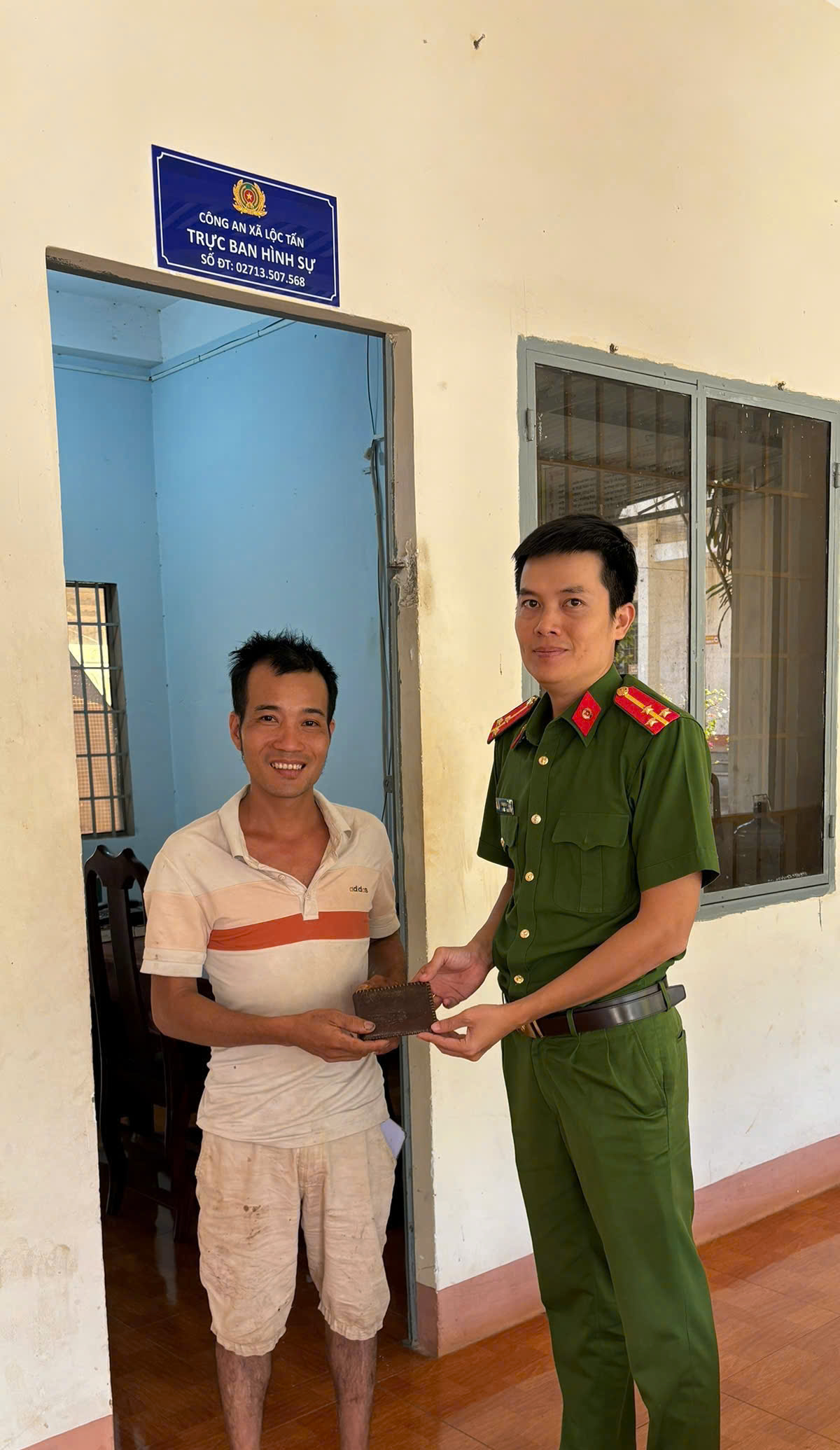 Ngay sau khi tiếp nhận vụ việc, Công an xã Lộc Tấn đã khẩn trương tiến hành xác minh thông tin từ các giấy tờ có trong ví và liên hệ được với chủ sở hữu là anh Hoàng Văn Quân (sinh năm 1987, hộ khẩu thường trú: xã Kim Đông, tỉnh Ninh Bình), hiện đang sinh sống và làm nghề nuôi ong tại khu vực ấp K54, xã Lộc Tấn. Chỉ sau thời gian ngắn, toàn bộ tài sản và giấy tờ đã được Công an xã tổ chức trao trả đầy đủ, nguyên vẹn cho anh Quân.