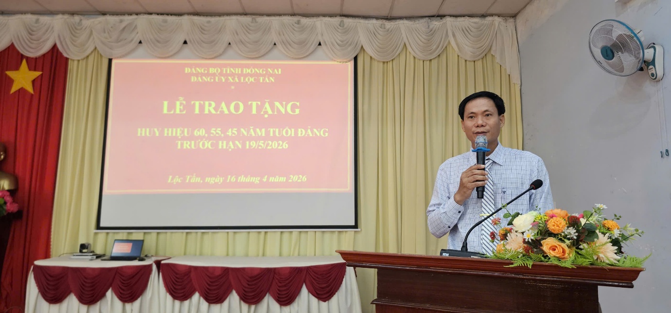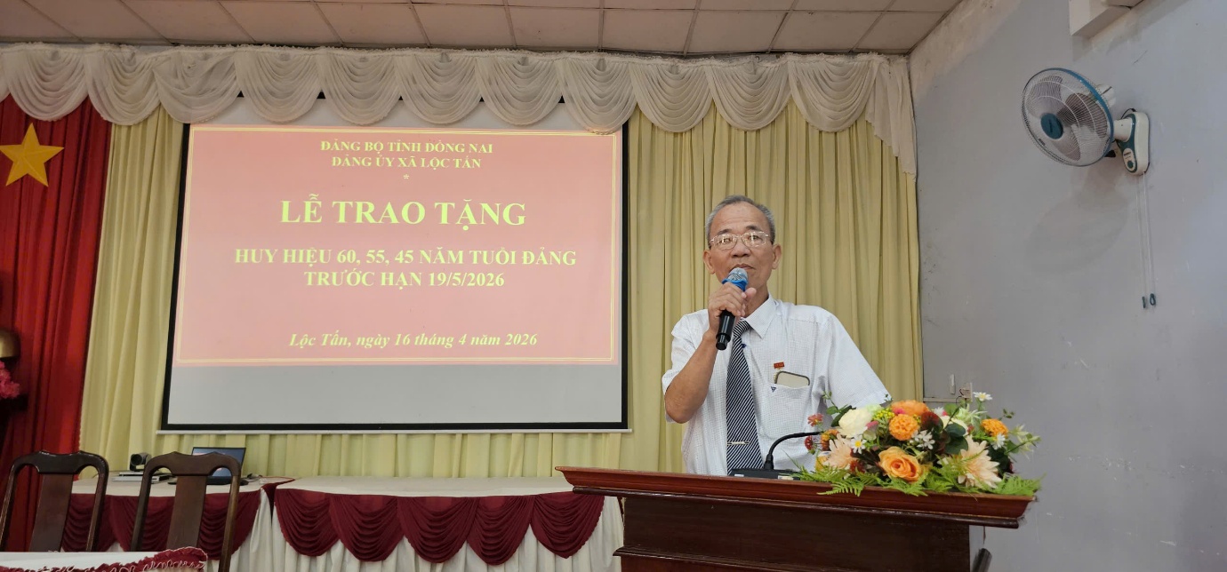<div style="text-align: justify;"><span style="font-size:11pt"><span style="line-height:107%"><span style="font-family:Aptos,&#039;sans-serif&#039;"><span style="font-size:14.0pt"><span style="line-height:107%"><span style="font-family:&#039;Times New Roman&#039;,&#039;serif&#039;">Ngày 15/4/2026, Đảng ủy xã Lộc Tấn đã long trọng tổ chức Lễ trao Huy hiệu 60, 55, 45 năm tuổi Đảng trước hạn 19/5/2026 cho các đảng viên lão thành đang sinh hoạt tại các chi bộ trên địa bàn xã.</span></span></span></span></span></span><br />