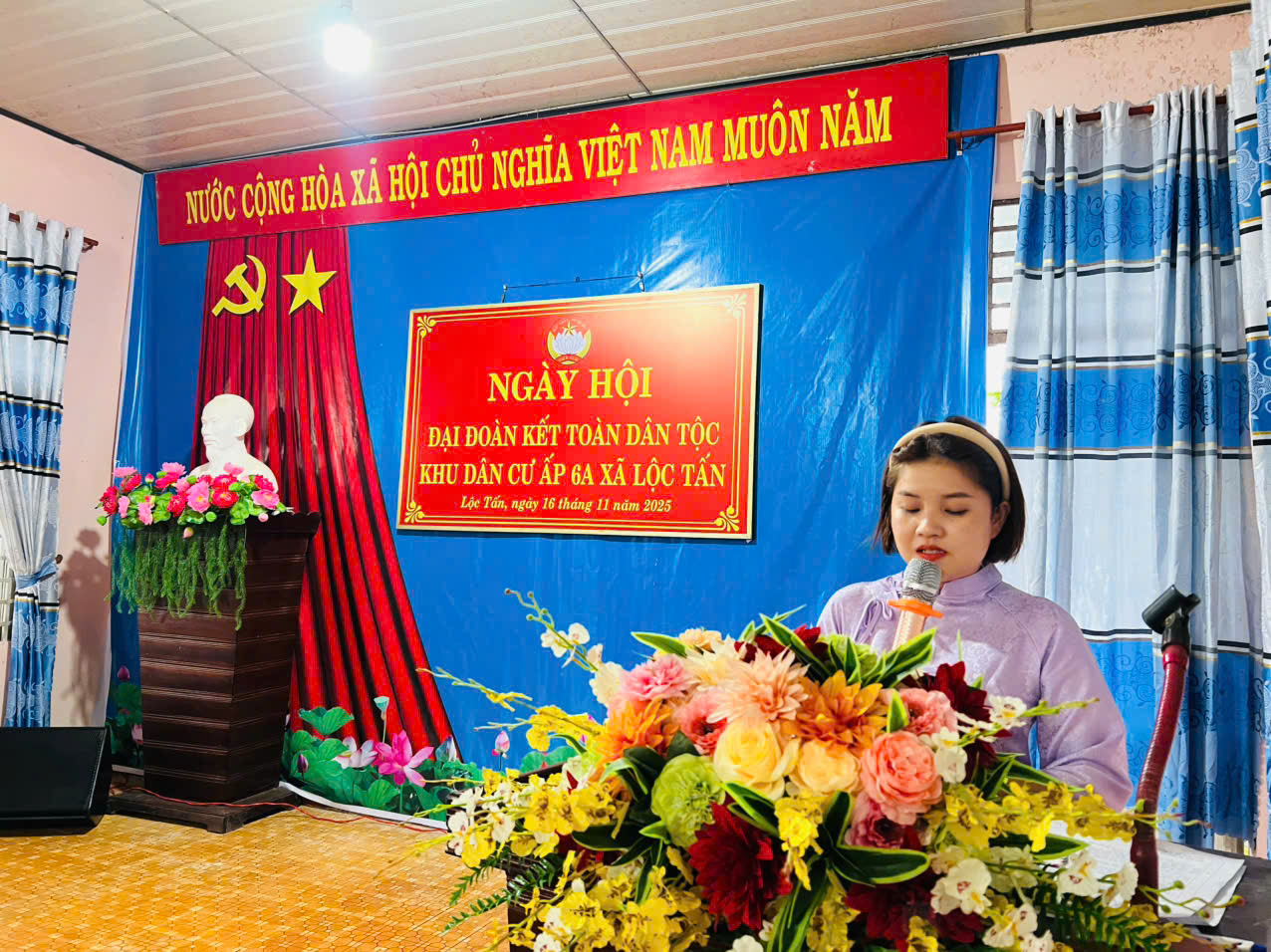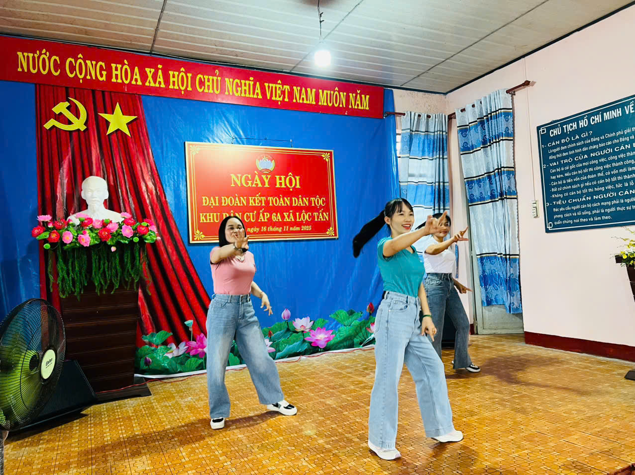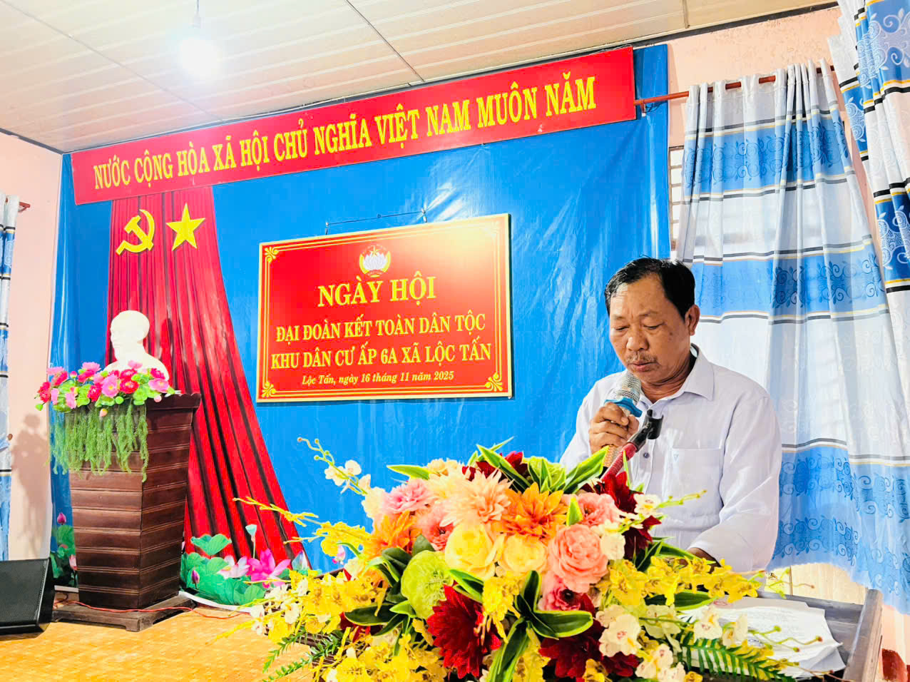 Hòa chung không khí Ngày hội Đại đoàn kết toàn dân tộc trên địa bàn xã Lộc Tấn, chiều ngày 16/11/2025, ấp 6A đã long trọng tổ chức Ngày hội Đại đoàn kết năm 2025. Sự kiện diễn ra trong không khí vui tươi, đoàn kết, thu hút đông đảo người dân tham gia, cùng nhau ôn lại truyền thống vẻ vang của Mặt trận Tổ quốc Việt Nam, đồng thời thắt chặt tình làng nghĩa xóm và phát huy sức mạnh khối đại đoàn kết toàn dân.