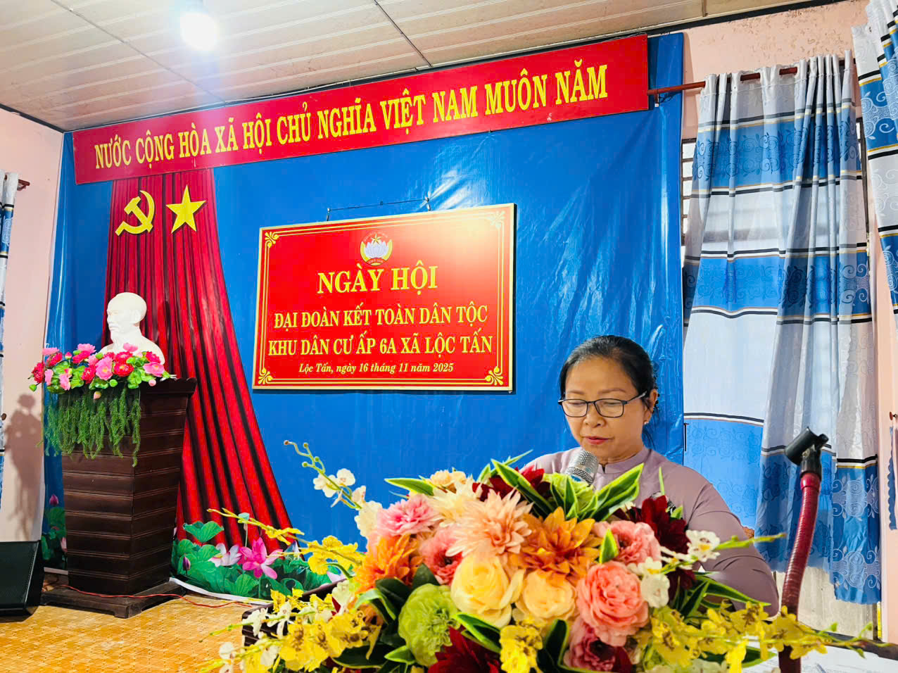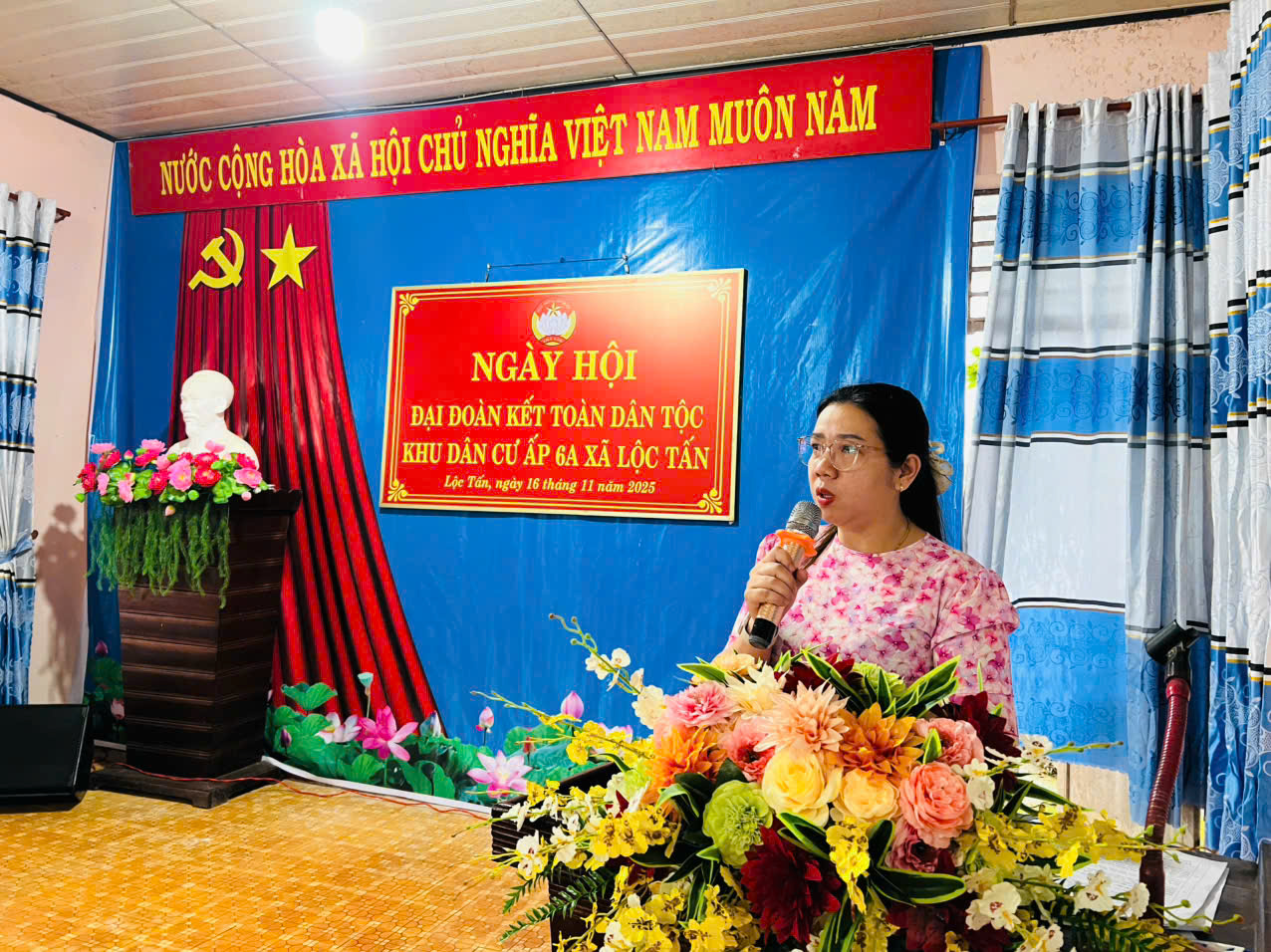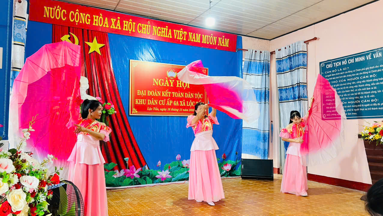 Hòa chung không khí Ngày hội Đại đoàn kết toàn dân tộc trên địa bàn xã Lộc Tấn, chiều ngày 16/11/2025, ấp 6A đã long trọng tổ chức Ngày hội Đại đoàn kết năm 2025. Sự kiện diễn ra trong không khí vui tươi, đoàn kết, thu hút đông đảo người dân tham gia, cùng nhau ôn lại truyền thống vẻ vang của Mặt trận Tổ quốc Việt Nam, đồng thời thắt chặt tình làng nghĩa xóm và phát huy sức mạnh khối đại đoàn kết toàn dân.