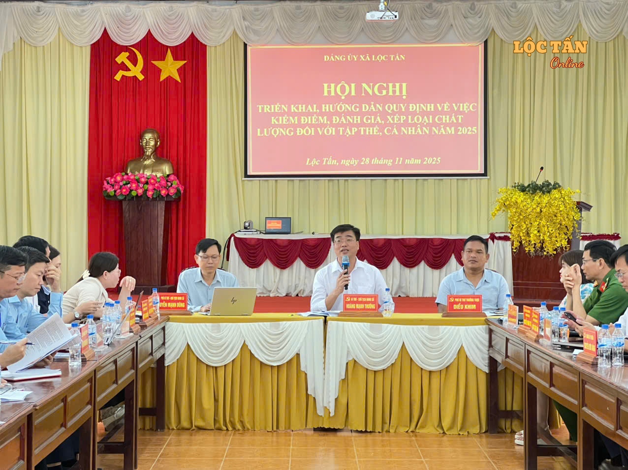 Ngày 28/11/2025, Đảng uỷ xã Lộc Tấn tổ chức Hội nghị triển khai các văn bản hướng dẫn về công tác kiểm điểm, đánh giá và xếp loại chất lượng tổ chức đảng, tập thể lãnh đạo và đảng viên năm 2025. Tham dự hội nghị có Thường trực Đảng uỷ, các đồng chí Ủy viên BCH Đảng bộ xã; Trưởng, Phó UBMTTQVN xã, Trưởng, Phó các đoàn thể Chính trị - xã hội xã; Trưởng, Phó các hội do Đảng và Nhà nước giao nhiệm vụ; Bí thư và Phó Bí thư các chi bộ trực thuộc.